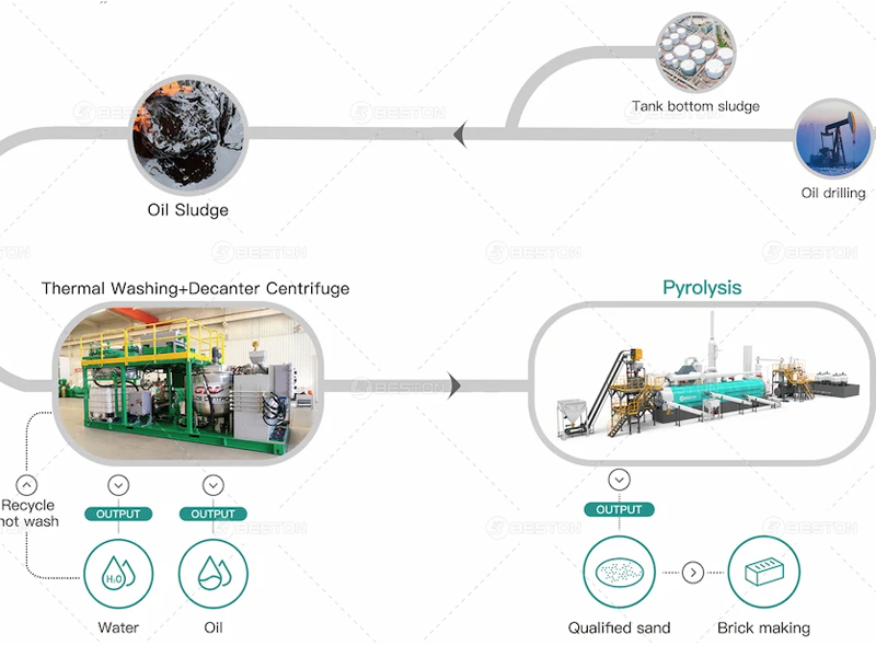 La extracción de petróleo crudo, la recolección y transporte de campos petroleros, el tratamiento de aguas residuales de refinerías y el suelo a lo largo de ríos o costas contaminados por la construcción y reparación de barcos, etc., todos pueden ser sometidos a la pirólisis. A través de la planta de pirólisis de lodo aceitoso, los residuos se pueden descomponer de manera eficiente en: aceite de pirólisis, arena negra, gas combustible y agua.